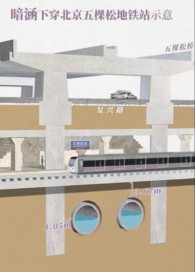 北京,五棵松地鐵站。站臺(tái)之上,列車年復(fù)一年穿梭呼嘯,乘客日復(fù)一日來(lái)往匆匆;站臺(tái)之下,僅3.67米處,兩條內(nèi)徑4米的輸水涵道穿行而過(guò),南水由此奔騰北上。